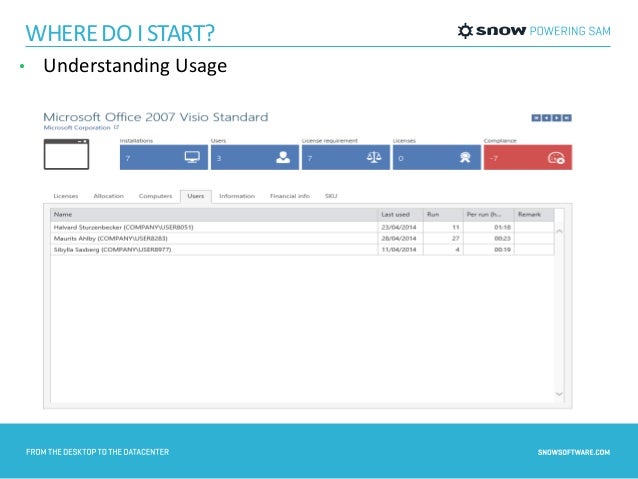 Snow for Office 365 with Snow Inventory consolidates visibility of all device-based licenses, AUTOMATIC DETECTION OF UNUSED SOFTWARE SUBSCRIPTIONS Snow for Office 365 automatically identifies unused licensing and subscriptions, Snow License Manager is the world’s leading SAM solution. ... View Doc
